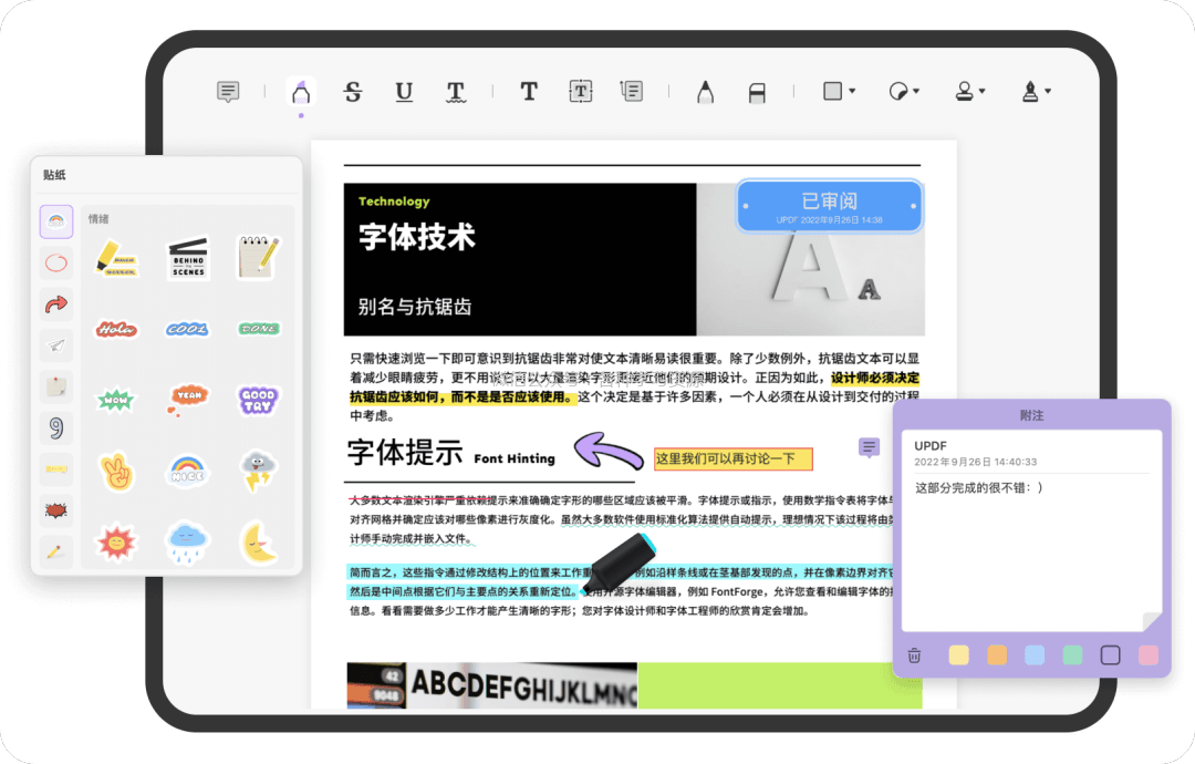 在注释功能上,UPD编辑器提供了多样化的选择,铅笔,便签,高亮,删除线,各种下划线,文本,文本框,文本标注,图形它都有!MAC端还支持橡皮,贴纸,签章,还有签名,上百种贴纸功能也让注释既醒目又美观。